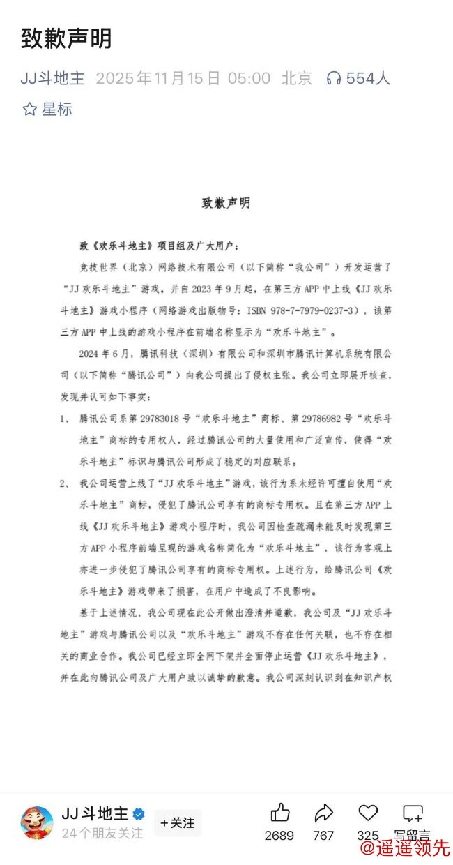 近日,竞技世界(北京)网络技术有限公司发布公开致歉声明,承认其运营的《JJ 欢乐斗地主》游戏及相关小程序,因擅自使用 “欢乐斗地主” 商标,侵犯了腾讯科技(深圳)有限公司及深圳市腾讯计算机系统有限公司的商标专用权,并已采取全网下架、全面停运等整改措施。